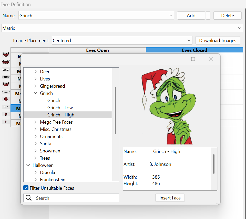 To download the singing Grinch images, in your layout element (MegaTree in the sequence), select Faces. That will bring up the Face Definition box, select 'Download Images', then Christmas->Grinch->Grinch - High.